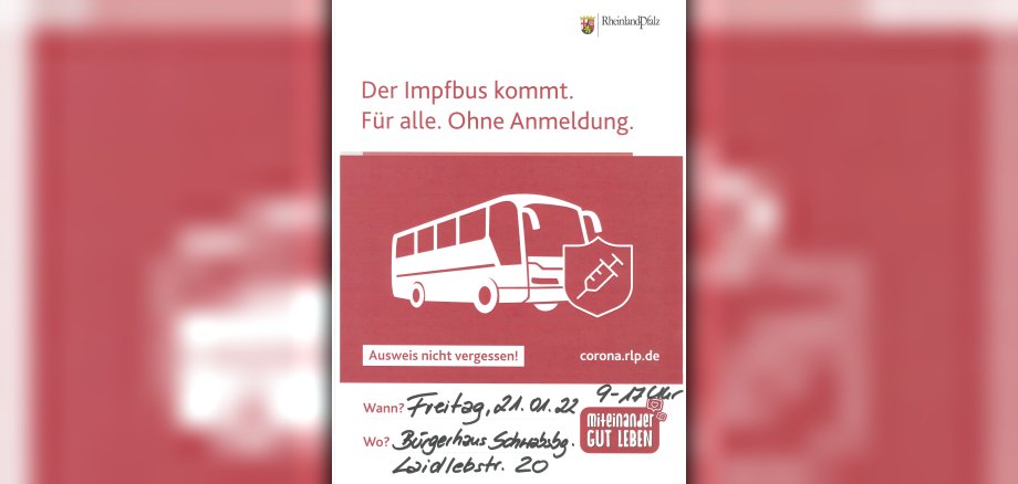 Stadtbürgermeister Jochen Schmitt und seiner Verwaltung ist es gelungen, dass Impfbus aus dem Gesundheitsministerium Rheinland-Pfalz am Freitag den 21. Januar 2022 Station in Schwabsburg macht.