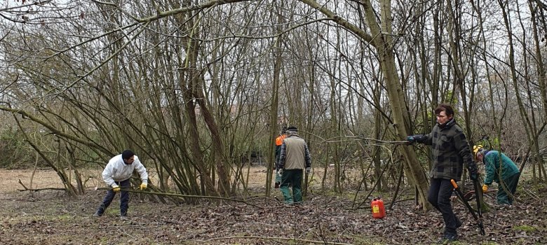 Am Samstag, 28. Januar, fand ein weiterer Einsatz statt. Jan Kropp hatte große Teile der Brombeeren-Hecken gemulcht und den Weg für weitere Arbeiten freigemacht. Erneut erschienen 19 Anwohnerinnen und Anwohner und fassten mit an. Otto-Peter Schauf konnte diesmal selbst mit Rolle, Traktor und Glühwein kommen und erwies sich zusätzlich als Virtuose an der Stihl. Wir hatten viel Spaß.