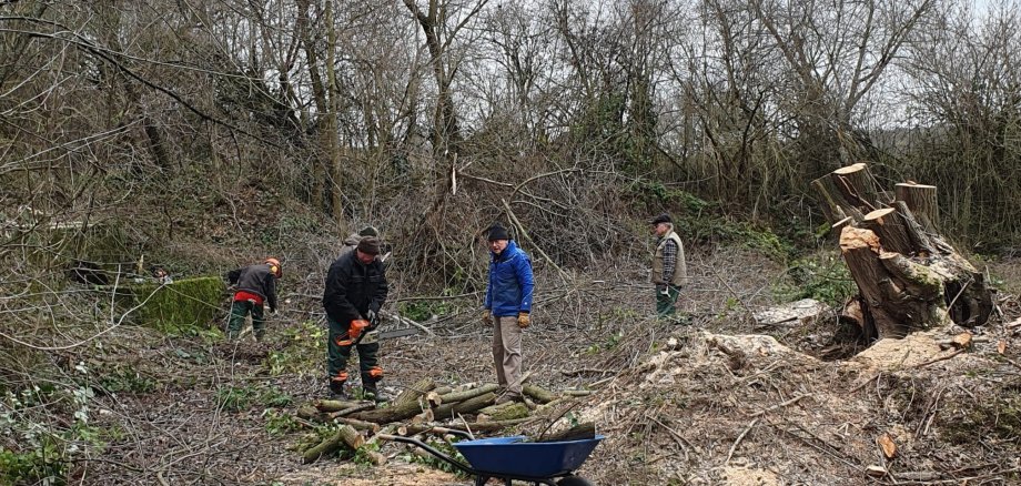 Vor unserem ersten Arbeitseinsatz am Samstag, 21. Januar 2023, fällte die Firma VAZA schnell und fachgerecht die nötigen Bäume. Am 21. Januar erschien zu den mehr als zwanzig Anwohnern, der VG-Bürgermeister Herr Groth um mit anzufassen. Wer wollte konnte mit ihm also an einem Strang/Ast ziehen. Der Kommentar einer Helferin "jetzt weiß ich wenigstens, dass ich den Richtigen gewählt habe" hat ihn sicher gefreut.