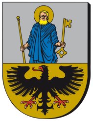 © Ortsgemeinde WeinolsheimDas Wappen zeigt im geteilten Schild in der oberen Hälfte in Silber die wachsende, blau gewandete Figur mit goldenem Heiligenschein des Heiligen Petrus in Vorderansicht, in der rechten Hand einen goldenen Wanderstab und in der linken Hand einen goldenen Schlüssel tragend; in der unteren Hälfte in Gold einen schwarzen, nach rechts blickenden rot bewehrten Adler.